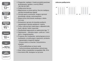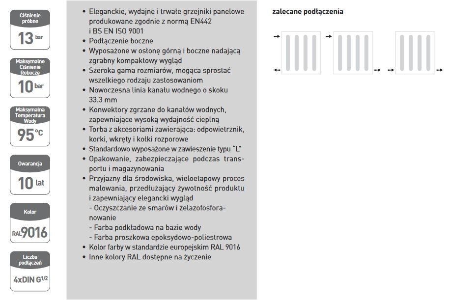 Powierzchnia grzejnika zabezpieczona jest przed korozja warstwą fosforanów, pokryta farbą kataforetyczną oraz warstwą utwardzonego lakieru proszkowego kolor RAL 9016.