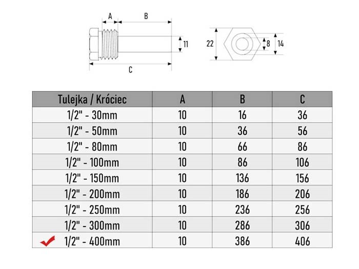 Kieszeń termometru 1/2" 400mm mosiężna - PG9 mosiądz kod wew: m166