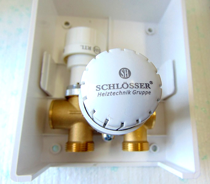 Zawór termostatyczny posiada dwie końcówki przyłączeniowe z gwintem zewnętrznym G3/4 przystosowane do złączek zaciskowych dostępnych w asortymencie Schlosser (PEX16x2 lub Cu 15x2). Zawór posiada odpowietrznik do odpowietrzania ręcznego.